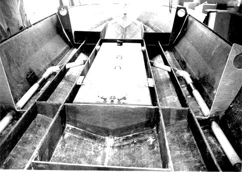 This is a good example of structural overkill, yet demonstates the builder's concern with strength. Also note the webs between stringers under the engine mounts that provide extra stability. Despite the appearance, these top hats are actually quite thin. When slamming occurs, the thin sections will absorb much of the impact, hence the web sections to increase stability and insure that the engine beds do not move.