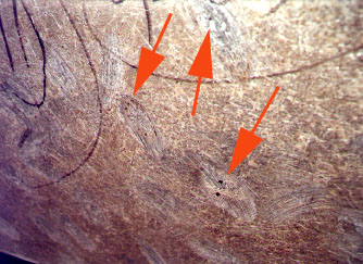 This photo, not this essay's subject vessel, shows a boat bottom with at least two dozen grind spots in little more than one square foot area.